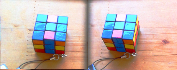 平行法(右の画像を右目で眺め・左の画像を左で眺める)で見ると、小さなルービックキューブが奥行き感豊かにせり上がってきます。