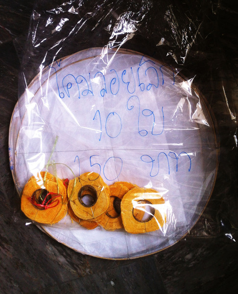 そしてまた、ヘンだけど奇妙に可愛い(まるで熊本県PRマスコットキャラクターのくまもんみたいな)「顔模様」のコムファイが屋台にたくさん吊され並んでいたりします。こうした色モノ系キャラクタたちも、普通の伝統的コムファイやコムローイと同じように、希望や夢を積んで空に飛ばされていくのです。