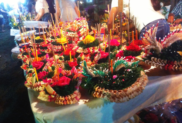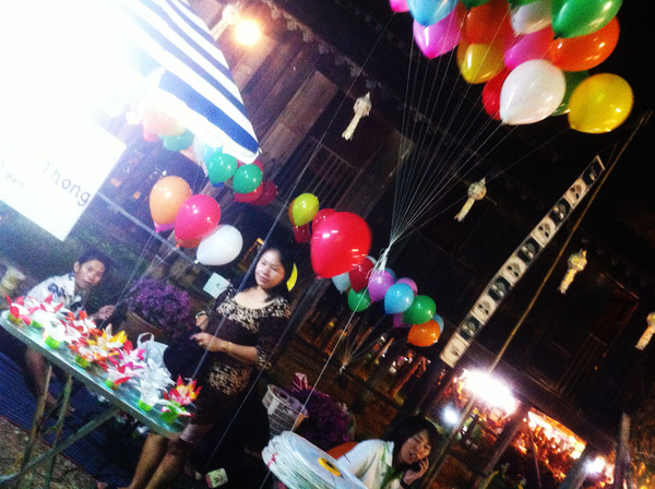 2013年、チェンマイのロイクラトンで、空に流されていくコムファイ・コムローイを眺めてみると、一昨年2011年には見かけなかった「変わり種コムローイ」を見つけました。…それは、いくつかのヘリウム風船にぶら下げられ空高く上がっていくクラトン(灯籠)です。川面に浮かべ・流されていくはずの灯籠が、ヘリウム風船にぶら下げられて、どこか遠くの空に飛ばされているのです。
