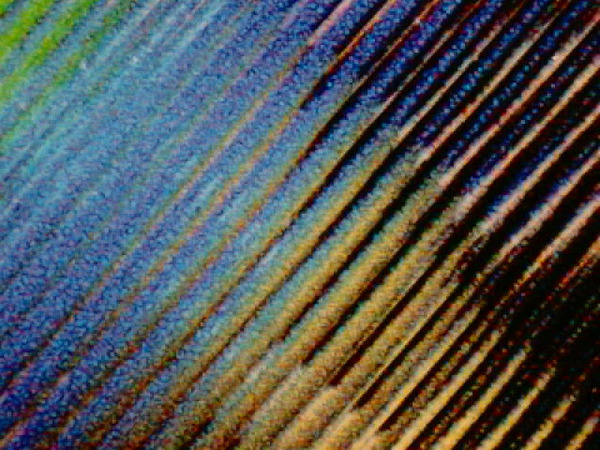 「そんな答えが合っているかどうか」を確かめたくて、念のため、手元にあった「レンチキュラー・シートを使った”分子構造”の立体画像」に(家にある材料の中では屈折率がプラスチックに近い液体である)サラダ・オイルを振りかけて、顕微鏡で真上から撮影したのがこの写真です。プラスチック・レンズにサラダオイルを振りかければ、当たり前の話ですが、レンズ効果はどこか遠くに消え失せて、レンズの無効にどんな画像が描かれているのかを自然に眺めることができるようです。