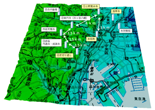 それに対して、東円寺(市ヶ谷八幡)から赤坂成満寺や芝切り通しへの「鐘の音リレー」は1.5km程度の間隔となっていて、こちらはとても自然だ。
