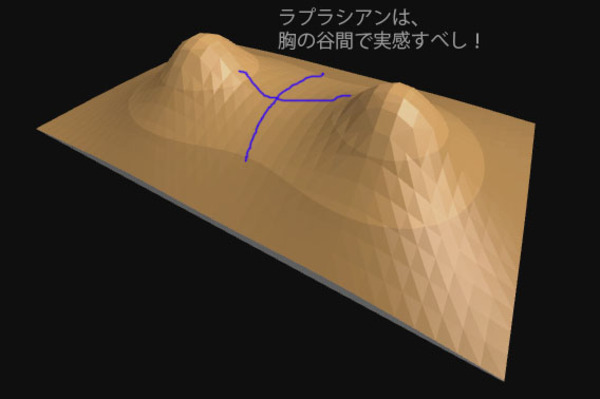 ラプラス作用素 ∇・(∇)は、この曲面でこそ、一番わかりやすく実感できます。 ラプラス作用素 がゼロでない値になるという「ポワソン方程式」は、「平面を押し上げるふたつの胸の膨らみ」で「 ラプラス作用素 がゼロでない=盛り上がっていること(あるいは堀りえぐれていること)」実感することができます。…そして、ラプラス作用素 がゼロになるというラプラス方程式は、「胸の谷間の”馬の鞍”状の双曲面」のように、ある軸に曲がりがあったとしたら・(その軸の曲がりを生むように)その他の軸は逆の向きに曲がっているという状態を実感できるはずなのです。