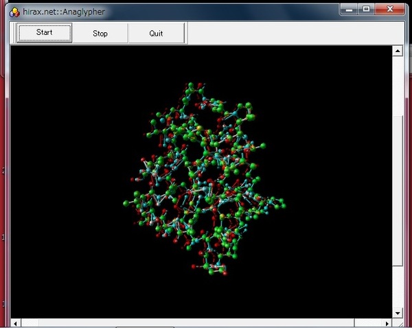 「3D AVS Player+YouTubeでお手軽三次元可視化をしてみよう」の続きとして、今日は、3D AVS Player"で視差画像を左右表示させているWindowを、アナグリフ(赤青メガネ)表示で時々刻々と眺めることができるようなソフトを作ってみることにしました。そのソフトウェアの動作画面が下になります。動作の仕組みはとても単純で、「選んだウィンドーの左半分と右半分を視差画像であるとして、アナグリフ用画像として合成したものをWindowに(20msに一回の割合で繰り返し)表示する」というだけのものです。