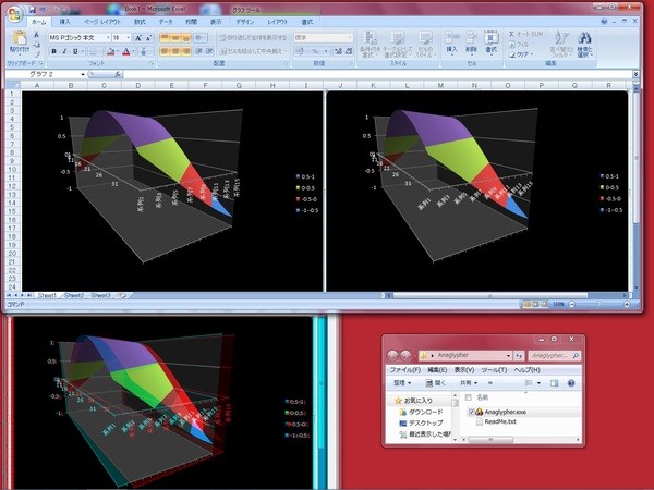 そこで、今日は同じデータに対して異なる視点から描画した2つのグラフを並べたMicrosoft Excelのウィンドウを、前回作ったソフトウェアで強引にアナグリフ立体画像にしてみることにしました。そのようすが、下(と右上)のスクリーンショットになります。