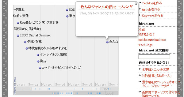 inside out コンテンツを年表形式で眺めることができるページを公開しました。マウスで年表を左へ右へ動かせば、タイムマシンのように過去と未来の間を行き来することができます。こういった「年表」は個人日記用途がもっとも相応しい、のかもしれません。